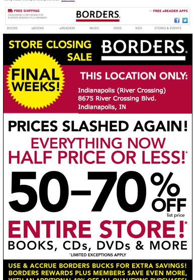 Was just there the other day, and I got an email with this update as the prices have gone from 40% off to 50% and more. It’s kind of creepy being in there, with all the blank shelves (which themselves are for sale). It’s also pretty sad, just having spent the time (and, money…although…I’ve read a lot of magazines while there that I didn’t have the money to buy) there that I have.